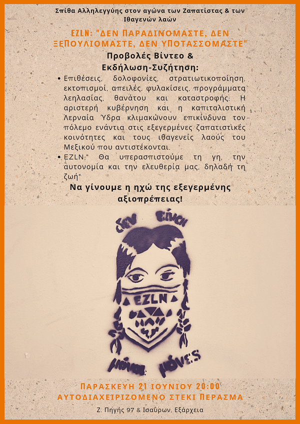 - Επιθέσεις, δολοφονίες, στρατιωτικοποίηση, εκτοπισμοί, απειλές, φυλακίσεις, προγράμματα λεηλασίας, θανάτου και καταστροφής: Η αριστερή κυβέρνηση και η καπιταλιστική Λερναία Ύδρα κλιμακώνουν επικίνδυνα τον πόλεμο ενάντια στις εξεγερμένες ζαπατιστικές κοινότητες και τους ιθαγενείς λαούς του Μεξικού που αντιστέκονται.